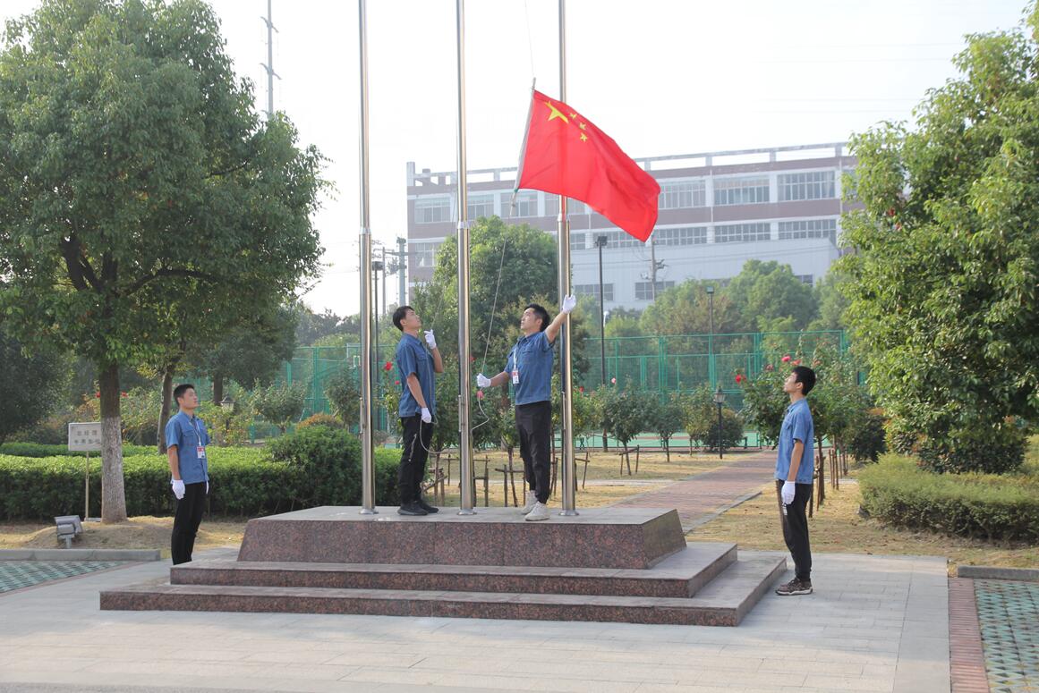 上午7:40分,在激昂的樂曲聲中,四名護旗隊員迎著東方,邁著鏗鏘有力的步伐從遠處走來,伴隨著莊嚴的國歌,國旗冉冉升起。